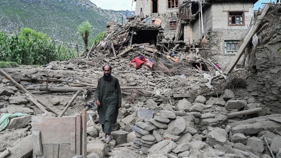 An man Afghan walks past a damaged house following earthquakes in the Mazar Dara village of Nurgal, a district of the Kunar Province, in Eastern Afghanistan, on September 1, 2025.