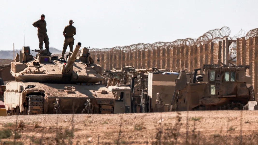 Israeli army soldiers stand atop the turret of a Merkava main battle tank positioned near armored military bulldozers along the border with the Gaza Strip in southern Israel on Sept. 2, 2025.