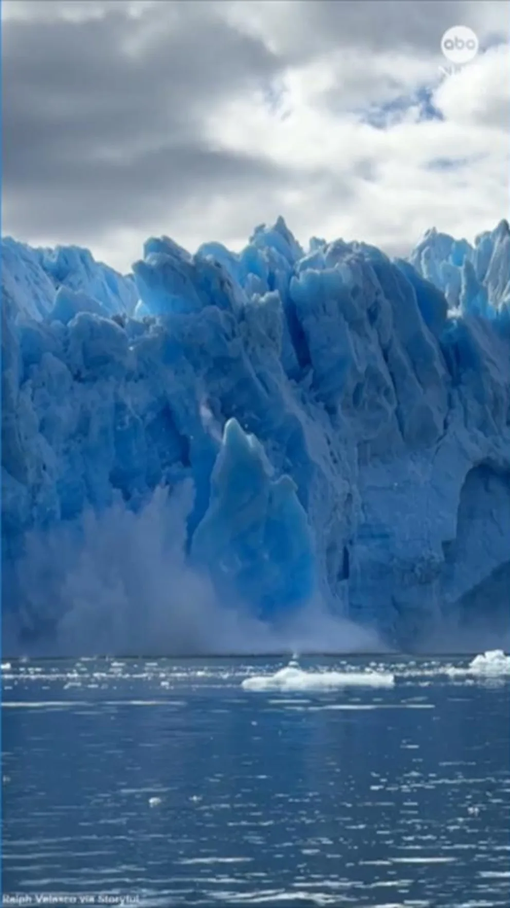 Eyewitness video captured a large chunk of ice breaking off in spectacular fashion from the Bruggen Glacier in southern Chile.