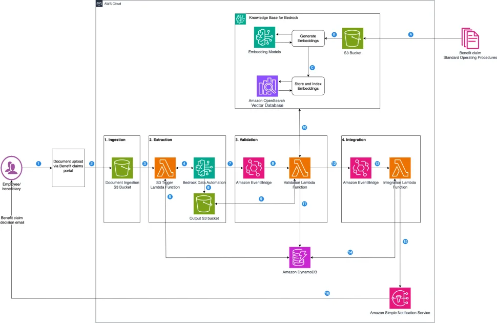 Generative AI can help address these challenges. With Amazon Bedrock Data Automation, you can automate generation of useful insights from unstructured multimodal content such as documents, images, audio, and video. Amazon Bedrock Data Automation can be used in benefits claims process to automate document processing by extracting and classifying documents from claims packets, policy applications, and supporting documents with industry-leading accuracy, reducing manual errors and accelerating resolution times. Amazon Bedrock Data Automation natural language processing capabilities interpret unstructured data, such as provider notes, supporting compliance with plan rules and regulations. By automating repetitive tasks and providing insights, Amazon Bedrock Data Automation helps reduce administrative burdens, enhance experiences for both employees and providers, and support compliance in a cost-effective manner. Furthermore, its scalable architecture enables seamless integration with existing systems, improving data flow across HRIS, claims systems, and provider networks, and advanced analytics help detect fraud patterns to optimize cost control.