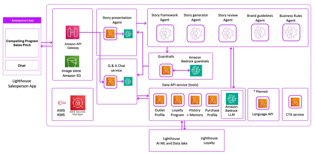 To address the challenges of personalization, scale, and putting the solution in the hands of tens of thousands of field sales teams, Vxceed developed Lighthouse Loyalty Selling Story, an AI-powered solution. The Lighthouse Loyalty Selling Story architecture uses Amazon Bedrock, Amazon API Gateway, Amazon DynamoDB, and AWS Lambda to create a secure, scalable, AI-powered selling story generation system. The solution implements a multi-agent architecture, shown in the following figure, where each component operates within the customer’s private AWS environment, maintaining data security, scalability, and intuitive user interactions.
