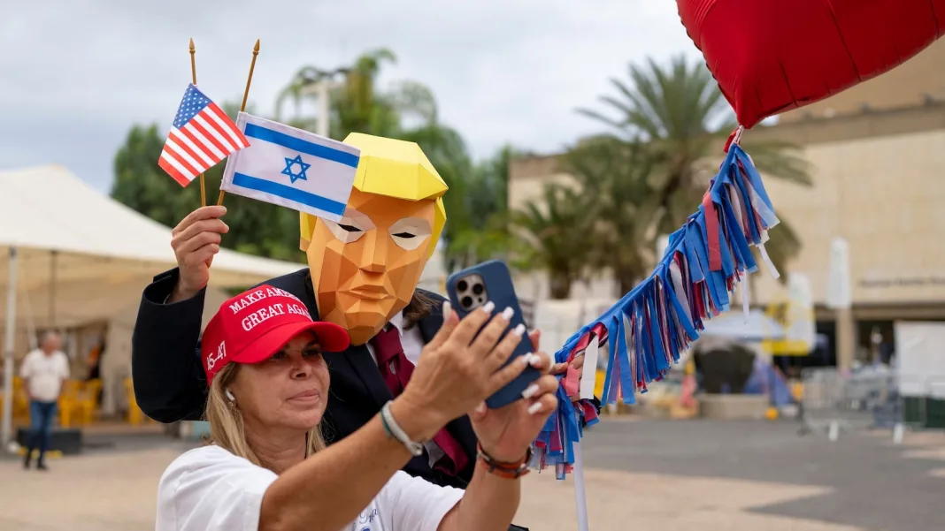 A person wearing a mask depicting U.S. President Donald Trump holds American and Israeli flags at Hostage Square in Tel Aviv on Oct. 9, 2025.