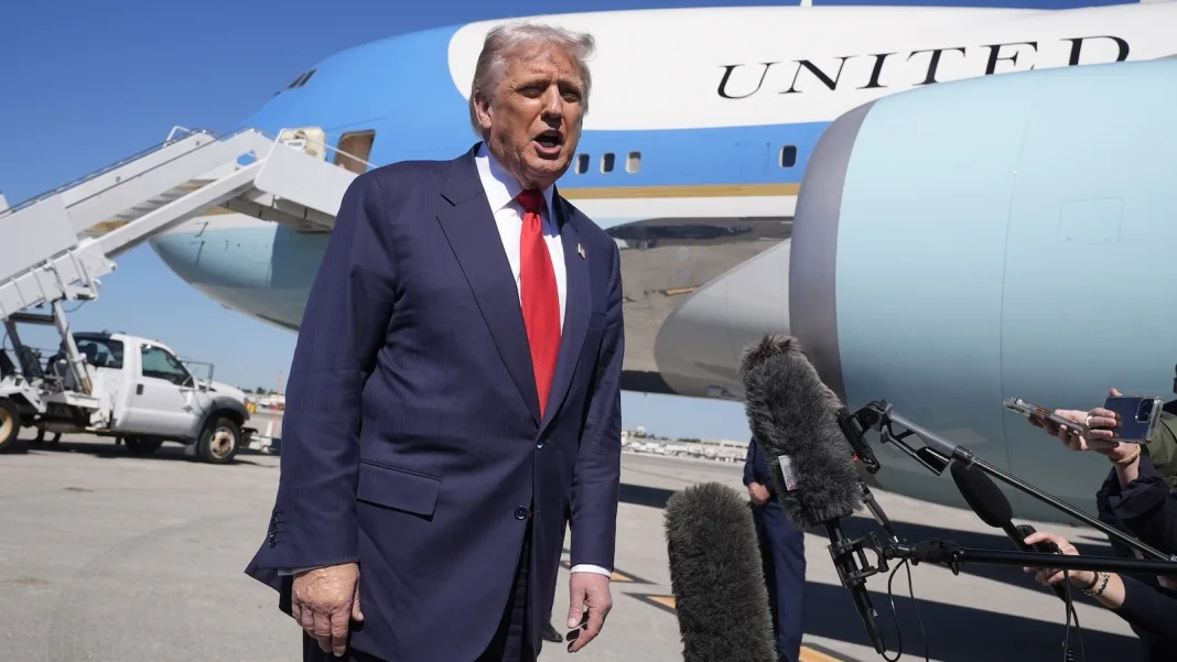 President Donald Trump speaks to reporters as he arrives at Palm Beach International Airport, October 31, 2025 in West Palm Beach, Florida.