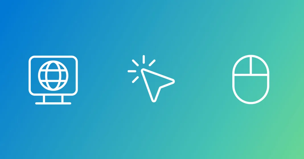 Three white line icons on a blue-to-green gradient background: a computer monitor with a globe symbol on the left, a cursor arrow with click lines in the center, and a computer mouse outline on the right.