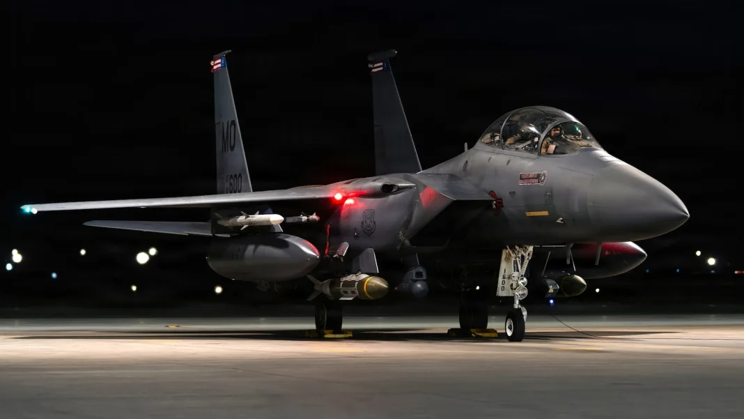 A U.S. Air Force F-15E Strike Eagle taxis at a base in the U.S. Central Command area of responsibility in support of Operation Hawkeye Strike, Jan. 10, 2026.