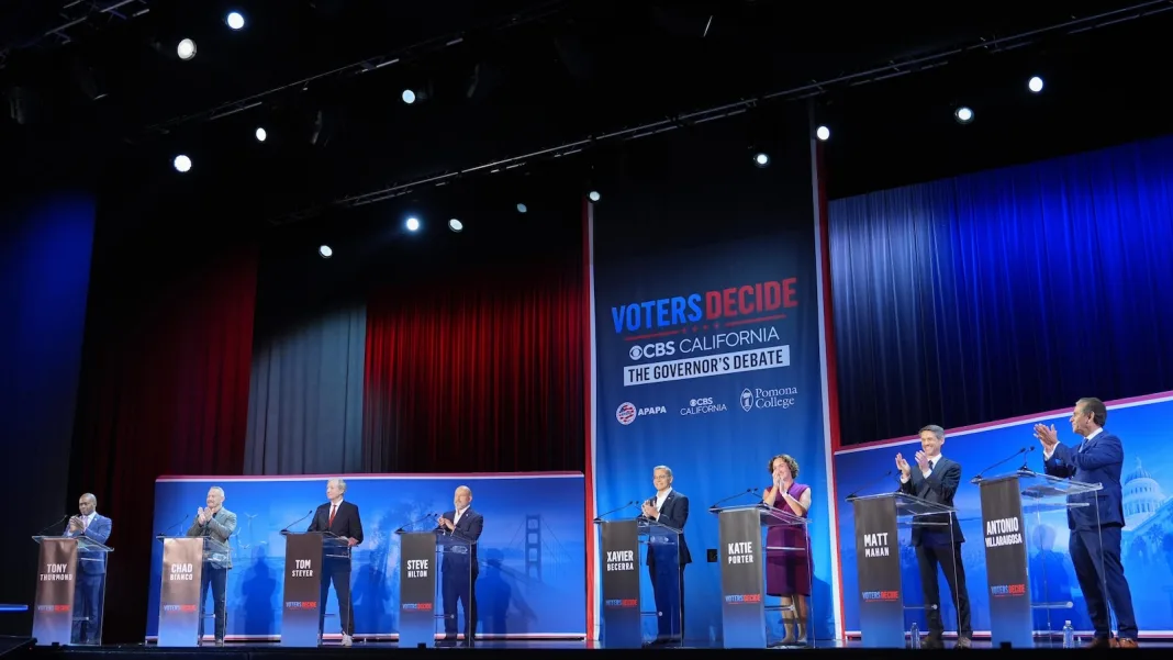 The debate brought together the two leading Republicans, conservative commentator Steve Hilton and county sheriff Chad Bianco; and six Democrats, former U.S. Rep. Katie Porter, San Jose Mayor Matt Mahan, billionaire Tom Steyer, former U.S. Health and Human Services Secretary Xavier Becerra, former Los Angeles Mayor Antonio Villaraigosa and state schools superintendent Tony Thurmond.